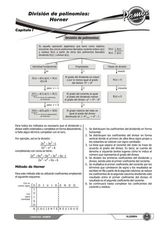 Este documento contiene un índice de 8 capítulos sobre álgebra. El capítulo I trata sobre la división de polinomios usando el método de Horner. El capítulo II explica la división de polinomios usando el método de Ruffini y el teorema del resto. El capítulo III cubre el MCD y MCM de polinomios. Los capítulos restantes abordan fracciones algebraicas, factoriales, el binomio de Newton y un repaso general.
