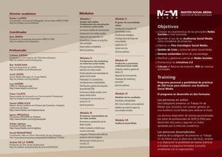 Este documento describe un programa de formación en marketing y comunicación en redes sociales que se llevará a cabo entre marzo y junio de 2017. El programa consta de 128 horas de formación presencial divididas en 8 módulos temáticos impartidos por expertos. Los participantes aprenderán estrategias de marketing, gestión de comunidades online, producción de contenido y medición de resultados en redes sociales. Deberán presentar un proyecto final para obtener el título de máster.