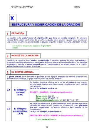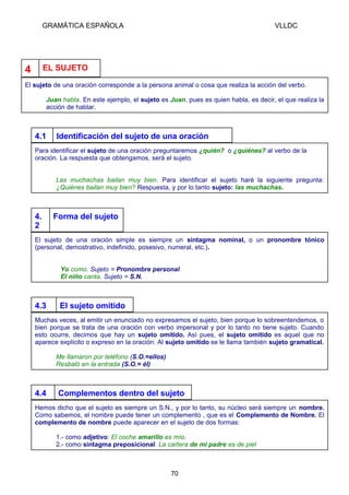 Este documento habla sobre la estructura y significado de la oración en español. Define la oración y sus partes principales como el sujeto y el predicado. Explica que el sujeto puede ser un sintagma nominal u otro tipo de grupo nominal, y que el predicado puede ser nominal u verbal dependiendo del tipo de verbo. También analiza los diferentes tipos de complementos que pueden aparecer dentro del predicado como el complemento directo, indirecto y circunstancial.