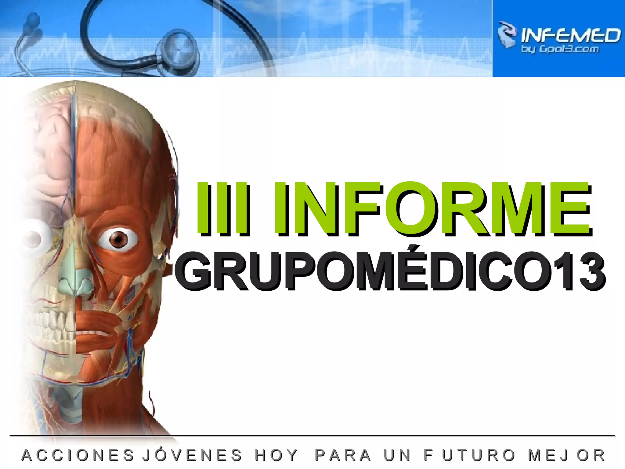 Este documento presenta un resumen de las actividades y proyectos del Grupo Médico 13, un grupo de estudiantes de medicina de la Universidad Autónoma de Guadalajara. El grupo ha creado sitios web como Infemed.com y Gpo13.com para ofrecer recursos adicionales de estudio. Entre sus proyectos se encuentran publicar material de más de 30 asignaturas médicas en línea, promover la prevención de enfermedades, participar en eventos de reforestación y deportivos, y trabajar en la creación de una fundación