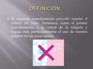 El segundo mandamiento prescribe respetar el nombre de Dios y prohíbe el juramento en falso o el uso inconveniente del nombre de Dios como la blasfemia, el juramento en falso que invoca a Dios como testigo de una mentira, y el perjurio que es una falta grave contra la fidelidad de Dios.