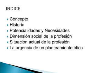 Una profesión implica prestar un servicio a la sociedad de forma institucionalizada, guiada por principios éticos. Tiene el doble objetivo de beneficiar a quien la ejerce y a la sociedad. Toda profesión requiere una formación especializada y está regulada por normas deontológicas que buscan el bien común.