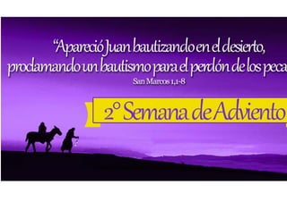 El documento resume el primer capítulo del Evangelio de San Marcos. Narra cómo Juan Bautista predicaba en el desierto, bautizando a la gente y pidiéndoles que se arrepintieran de sus pecados. Anunciaba la llegada de Jesús, a quien describía como más poderoso que él y digno de desatar sus sandalias.