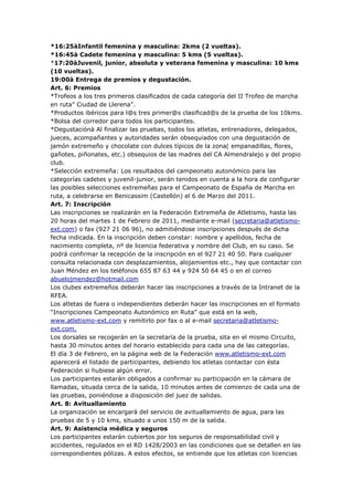 El documento presenta el reglamento del II Trofeo de Marcha en Ruta "Ciudad de Llerena" y el Campeonato Autonómico de Extremadura de Marcha en Ruta que se celebrará el 5 de febrero de 2011 en Llerena, Badajoz. El evento consta de varias categorías para marchadores de diferentes edades, con distancias de 1 a 10 km. Se detallan aspectos como la inscripción, horarios, premios, seguros y control médico durante la competición.
