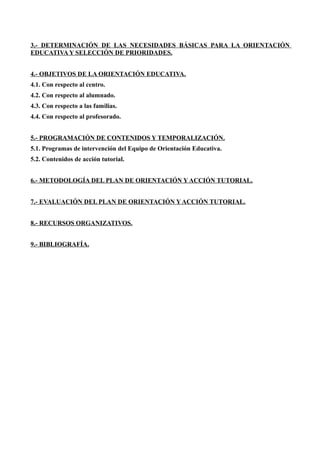 Este documento presenta el Plan de Orientación y Acción Tutorial (POAT) de un centro educativo. Incluye una introducción y fundamentación legal, un análisis de la situación inicial, la determinación de necesidades y prioridades, los objetivos de la orientación educativa con respecto al centro, el alumnado, las familias y el profesorado, y la programación y metodología del plan. El POAT tiene como objetivo guiar las actividades de orientación y tutoría del centro para mejorar la calidad educativa y satisfacer las necesidades detectadas como la integración del