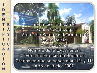 La feria de educación superior busca informar a 682 estudiantes de grados 10o y 11o sobre opciones de educación técnica, tecnológica y universitaria. 30 instituciones participarán presentando sus programas. El objetivo es que los estudiantes tomen decisiones informadas sobre su proyecto de vida y carrera profesional. La feria se ha institucionalizado en el PEI de la institución educativa para mejorar la orientación vocacional de los estudiantes.