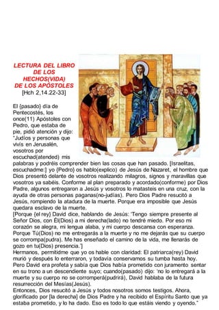 El documento resume el evangelio del tercer domingo de Pascua según San Lucas. Narra cómo dos discípulos iban caminando tristemente hacia Emaús después de la crucifixión de Jesús, cuando éste se les apareció sin que lo reconocieran. Jesús les explicó que el Mesías debía sufrir esto para entrar en su gloria. Al partir el pan con ellos, los discípulos lo reconocieron y volvieron apresuradamente a Jerusalén a contar a los otros que habían visto a Jesús resucitado.
