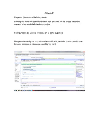 Este documento presenta varias herramientas de Google como carpetas, configuración de cuentas, Google Maps, Google Books, la rueda de búsqueda de Google, la biblioteca virtual de la UNAD, Google Calendar, Google Docs, Google Translate, Google News, Google Sites entre otras. También explica conceptos como Web 2.0, redes sociales, dirección IP, DNS, redes de computadoras, virus informáticos, medios de transmisión e hipertexto.