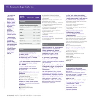Este documento describe un curso de dos días sobre comunicación corporativa en línea. El curso cubrirá temas como el impacto de Internet y los nuevos medios sociales en la forma de comunicar de las empresas, el uso de la intranet, la web corporativa y los nuevos medios sociales como Facebook y blogs. El curso también analizará cómo gestionar la comunicación y reputación corporativa en tiempos de crisis en la era digital.