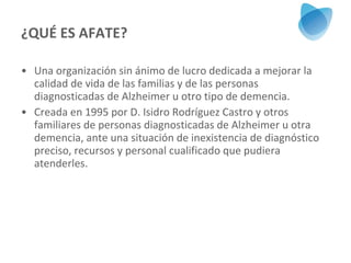 AFATE es una organización sin ánimo de lucro establecida en 1995, dedicada a mejorar la calidad de vida de familias afectadas por Alzheimer y otras demencias en Tenerife. La asociación ofrece servicios de atención a los enfermos y apoyo a sus cuidadores, incluyendo estimulación cognitiva y ayuda a domicilio, y opera con subvenciones, cuotas de socios y formación. Con 932 beneficiarios directos en 2009 y un equipo comprometido de 55 profesionales, AFATE busca ser un referente en la atención socio-sanitaria en la región.