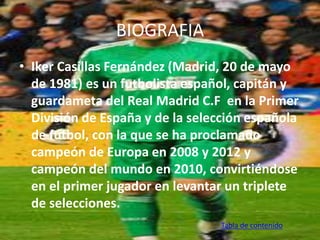 El documento proporciona información biográfica y sobre la trayectoria de Iker Casillas, capitán de la selección española y del Real Madrid. Se detalla que Casillas ha desarrollado toda su carrera en el Real Madrid y es considerado el mejor portero del mundo en la última década. Además, ha ganado la Eurocopa en dos ocasiones y el Mundial con España, siendo el primer jugador en lograr este triplete de títulos con una selección.
