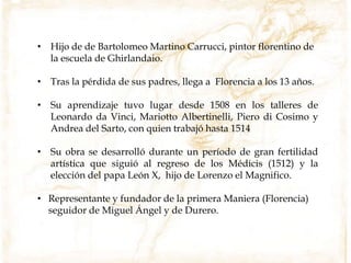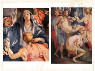 Jacopo Carrucci, conocido como Il Pontormo, fue un pintor manierista italiano del siglo XVI. Recibió su formación en Florencia y trabajó principalmente para los Medici y la iglesia. Es conocido por sus figuras alargadas y contorsionadas que muestran gran expresividad emocional. Sus obras maestras incluyen El descendimiento de la cruz, pintado para la Capilla Capponi, que representa las figuras en poses dramáticas e irrealistas. Pontormo también creó frescos notables como la Resurrección para la Certosa di Gall