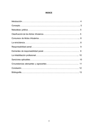 Este documento define y clasifica los diferentes tipos de ilícitos tributarios según la legislación venezolana. Explica que los ilícitos tributarios son acciones u omisiones que violan las normas tributarias. Los clasifica en ilícitos formales, relativos a especies fiscales y gravadas, e ilícitos materiales. También describe las sanciones aplicables como multas, prisión, clausura de establecimientos e inhabilitación profesional. Por último, analiza conceptos como concursos de ilícitos, reincidencia, eximent