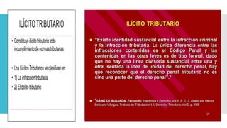 Este documento define y clasifica los ilícitos tributarios según la legislación venezolana. Explica que los ilícitos tributarios son violaciones a las normas tributarias y constituyen delitos penales. Se dividen en ilícitos formales, relacionados con incumplimientos administrativos, e ilícitos materiales como evasión de impuestos. El ilícito más grave es la divulgación no autorizada de información confidencial de terceros. Las sanciones incluyen prisión para directivos de empresas y multas pecuniarias.