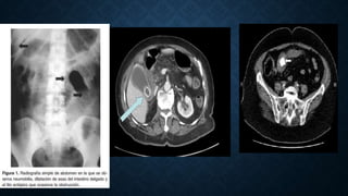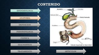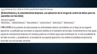 Este documento trata sobre el íleo biliar, una obstrucción intestinal mecánica causada por la migración de cálculos biliares al intestino delgado. Afecta principalmente a mujeres mayores de 65 años con enfermedades crónicas. Se presenta luego de un episodio de colecistitis aguda o crónica, causando inflamación, adherencias y eventualmente una fístula entre la vesícula biliar y el intestino. El diagnóstico se realiza mediante radiografía abdominal, TAC o ecografía buscando la triada de Rigler