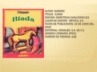 El resumen describe el libro La Ilíada de Homero. Narra la guerra de Troya entre los griegos y troyanos, incluyendo eventos clave como cuando Agamenón toma a Briseida de Aquiles, causando una disputa entre ellos. Culmina con la muerte de Héctor a manos de los griegos y una tregua final entre los bandos.