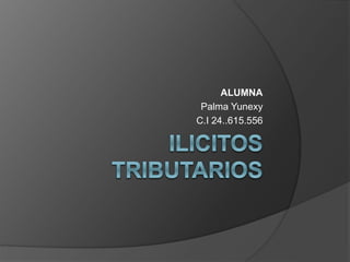 Este documento resume los principales tipos de ilícitos tributarios según la legislación venezolana, incluyendo ilícitos formales, relativos a especies fiscales y gravadas, materiales, y aquellos con penas privativas de libertad. También describe los principios constitucionales relacionados y las sanciones aplicables, como multas, decomiso de bienes, cierre temporal de establecimientos e inhabilitación profesional.
