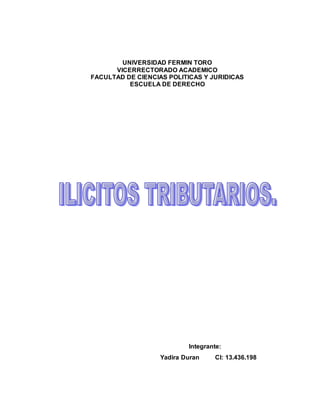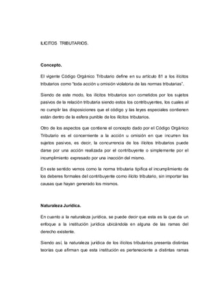 El documento describe los ilícitos tributarios según el Código Orgánico Tributario, definiéndolos como acciones u omisiones que infringen normas fiscales cometidas por los contribuyentes. Se clasifican en ilícitos formales, materiales y penales, cada uno con sanciones específicas y consecuencias legales. Además, se discute la naturaleza jurídica de estos ilícitos, concordando que poseen un carácter autonómico dentro del derecho tributario, regulados por sus propias normas y sanciones.