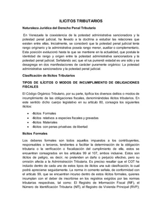 Este documento resume la naturaleza jurídica del derecho penal tributario en Venezuela y clasifica los diferentes tipos de ilícitos tributarios según el Código Orgánico Tributario. Describe los ilícitos formales, relativos a especies fiscales y gravadas, materiales e ilícitos con penas privativas de libertad. Explica que los ilícitos formales son aquellos que no pretenden daño efectivo pero afectan a la administración tributaria, como incumplir deberes de inscripción, facturación y contabilidad.