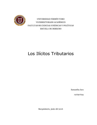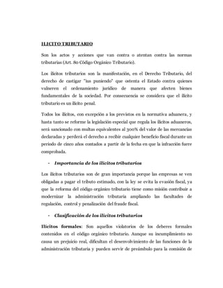 Este documento define y clasifica los diferentes tipos de ilícitos tributarios según la legislación venezolana. Describe ilícitos formales, relativos a especies fiscales y gravadas, materiales, y aquellos sancionados con pena restrictiva de libertad. Explica las sanciones aplicables como multas, destrucción de bienes, clausuras, y prisión. También cubre causas de extinción, responsabilidad, circunstancias agravantes y atenuantes. Finalmente presenta un caso práctico de una empresa gastronómica que