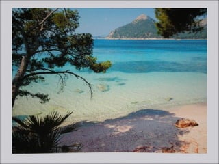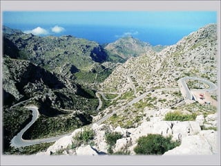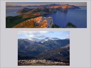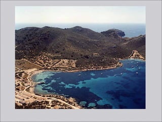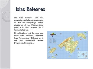 El documento proporciona información sobre las Islas Baleares, incluyendo su ubicación, composición e historia. Brevemente describe la prehistoria y colonización de las islas por diferentes culturas como fenicios, cartagineses y romanos. También resume la conquista cristiana por Jaime I de Aragón en los siglos XIII y la posterior dominación británica de Menorca en el siglo XVIII. Finalmente, menciona la autonomía obtenida en el siglo XX.