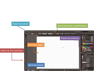 Las principales características de una interfaz gráfica de usuario incluyen una barra de menús y aplicaciones, un panel de control, un área de trabajo, una barra de estado y una paleta de ventanas.