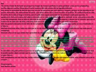 Este documento es una carta de cumpleaños para Ilse de parte de Alex Nelson Zárate. En la carta, Alex expresa su admiración y respeto por Ilse, diciendo que ella ha demostrado fortaleza en los peores momentos. Le desea a Ilse que continúe contando con su amistad y que encuentre la felicidad que se merece a lo largo de los años. Finalmente, le da algunos consejos de vida a Ilse, incluyendo que viva el presente y siga sus sueños sin pisotear a otros, y le desea un feliz cu