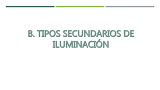 El documento presenta información sobre iluminación, incluyendo diferentes tipos de lámparas (halógenas, incandescentes, fluorescentes, de descarga), sistemas de iluminación (directa, indirecta, semi-directa), y parámetros para el diseño de iluminación como el nivel de iluminación, coeficiente de utilización, y factor de mantenimiento. También describe el método para diseñar un sistema de iluminación que incluye determinar los lúmenes, número de lámparas y luminarias necesarias.