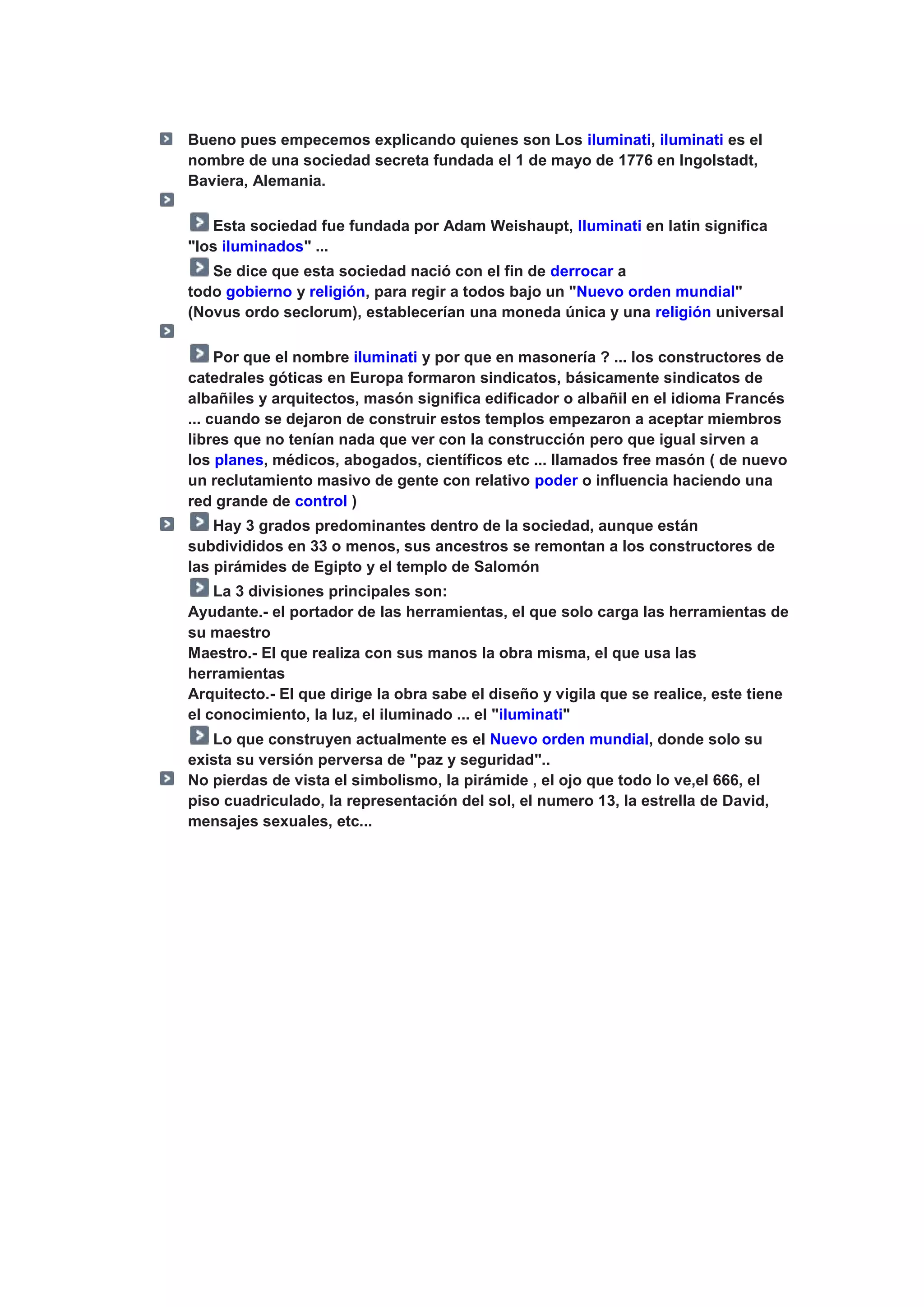El documento explica que Los Iluminati fue una sociedad secreta fundada en 1776 en Alemania por Adam Weishaupt con el objetivo de derrocar gobiernos y religiones para establecer un Nuevo Orden Mundial. Explica que la masonería surgió de los gremios de albañiles y arquitectos y que actualmente Los Iluminati buscan construir ese Nuevo Orden Mundial a través de símbolos como la pirámide y el ojo que todo lo ve.