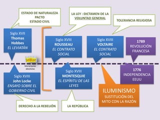 El documento describe las teorías políticas y filosóficas que surgieron durante la Ilustración en Francia en el siglo XVIII, incluyendo las obras de Hobbes, Locke, Rousseau, Montesquieu y Voltaire. Estas ideas cuestionaron el poder absoluto de los monarcas y promovieron conceptos como la soberanía popular, la separación de poderes y la tolerancia religiosa. Finalmente, estas nuevas corrientes de pensamiento llevaron a la Revolución Francesa de 1789.