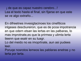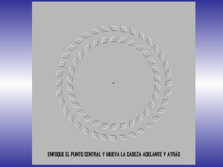 Este documento presenta varias ilusiones ópticas y efectos visuales extraños. Explica que nuestro cerebro tiende a interpretar las palabras basándose en el patrón general en lugar de cada letra individual, y que los niños pequeños a veces no pueden distinguir entre parejas de objetos. Finalmente, invita al lector a mirar fijamente cuatro puntos en el centro de un dibujo y luego parpadear para ver una ilusión residual en sus ojos.