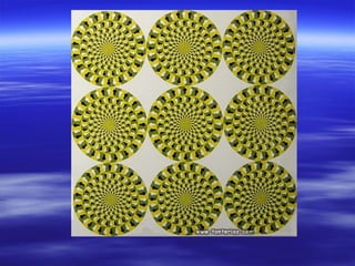 Este documento presenta dos ilusiones ópticas: cuadrados grises que parecen de colores diferentes aunque son del mismo color, y líneas rojas pequeñas que parecen curvas pero en realidad son paralelas y rectas. Se hacen preguntas sobre si las líneas están en el suelo o son rectas o curvas a pesar de su apariencia.