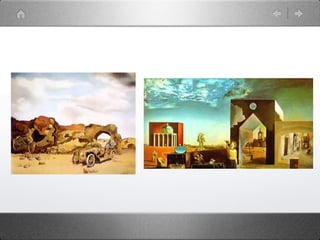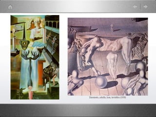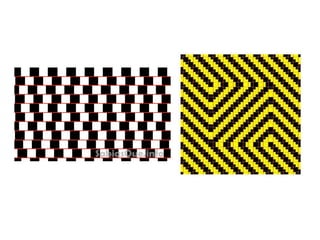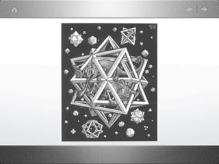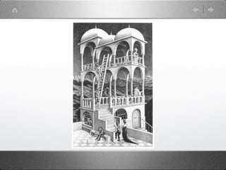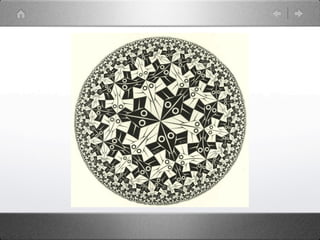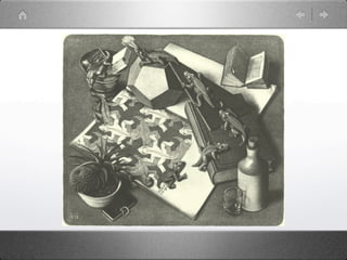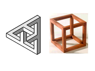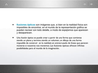 Este documento describe diferentes tipos de ilusiones ópticas, incluyendo figuras imposibles y figuras cinéticas. Explica cómo varios artistas, como Escher, Dalí y Arcimboldo, han utilizado ilusiones ópticas en sus obras para crear efectos de profundidad, ambigüedad y movimiento. Se proporcionan ejemplos detallados del trabajo de Escher con teselaciones y mundos imaginarios, así como las técnicas de Dalí y Arcimboldo para crear imágenes surrealistas y retratos a partir de objetos respectivamente