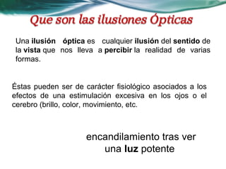 Una ilusión óptica es cualquier ilusión del sentido de la vista que nos lleva a percibir la realidad de varias formas, ya sea por efectos fisiológicos como el encandilamiento o ilusiones cognitivas que dividen en ambigüedad, distorsión, paradójicas y alucinaciones. El cerebro solo puede concentrarse en un objeto y cuando se presentan dos formas en una imagen causa confusión y desorden, llevando a ver otra visión distinta de la realidad.
