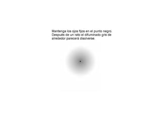 El documento presenta varios ejercicios y acertijos ópticos, incluyendo figuras que parecen moverse aunque son estáticas, líneas que parecen curvarse aunque son rectas, y preguntas sobre el número y tipo de figuras que pueden verse en imágenes. También incluye instrucciones para realizar una ilusión óptica moviendo la cabeza y haciendo clic con el mouse.