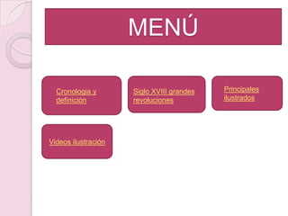 El documento resume los conceptos clave de la Ilustración en el siglo XVIII, incluyendo su definición como un movimiento que buscaba iluminar el mundo con la razón, las grandes revoluciones del periodo como la independencia de EE.UU. y la Revolución Francesa, y los principales ilustrados como Montesquieu, Voltaire, Rousseau y Adam Smith.