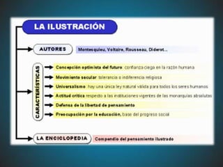 El documento describe el movimiento de la Ilustración que ocurrió entre los siglos XVII y XVIII en Europa. Los ilustrados promovieron el uso de la razón y el pensamiento racional para liberar a la gente de las tradiciones sin valor, especialmente las religiosas. Se mencionan varios pensadores importantes de este periodo como Locke, Rousseau, Montesquieu, Voltaire y Adam Smith y sus contribuciones al pensamiento liberal, la tolerancia religiosa, la separación de poderes y el desarrollo de la economía.