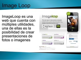 ImageLoop es una página web que permite crear presentaciones de fotos de manera sencilla. Los usuarios pueden registrarse para editar y administrar sus presentaciones o usar las herramientas sin registrarse. Para crear una cuenta, deben completar un pequeño formulario. Lamentablemente, durante la semana los servicios no funcionaron para probarlos, pero se puede descargar la aplicación para iPhone para subir y compartir fotos.