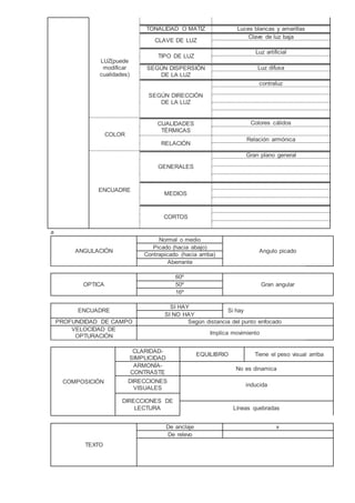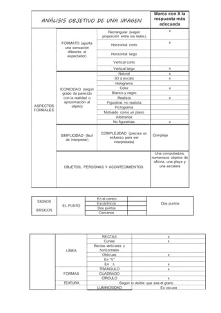 Este documento analiza una imagen de forma objetiva y subjetiva. Objetivamente, la imagen tiene un formato vertical largo, es realista y en 3D, con figuras geométricas como triángulos y círculos. Contiene objetos de oficina como una computadora y libros. Subjetivamente, la imagen representa una situación estresante debido a la gran cantidad de material, lo que pretende provocar estrés en el espectador.