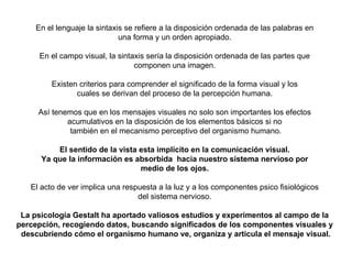 El documento analiza los fundamentos psicológicos, físicos y fisiológicos de la percepción visual y la sintaxis de las imágenes. Explica que la percepción está influenciada por leyes gestálticas como la proximidad, igualdad y continuidad. También describe elementos morfológicos como el punto, línea y plano, y elementos de disposición como el equilibrio, peso y atracción.