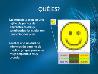 Una imagen digital está compuesta de píxeles, que son unidades de color. La resolución de una imagen se refiere a la cantidad de píxeles por pulgada, y determina la calidad y tamaño de la imagen. Existen diferentes formatos para comprimir imágenes, como GIF, JPEG y PNG, cada uno con ventajas para diferentes tipos de imágenes.