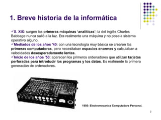 Este documento describe brevemente la historia de la computación y el desarrollo de los sistemas operativos como Windows, Macintosh y Linux. También explica conceptos básicos sobre el funcionamiento de los ordenadores, periféricos utilizados para crear y manipular imágenes digitales, y formatos comunes como JPEG, GIF y TIFF. Finalmente, cubre temas como el tamaño de archivo, resolución y dimensiones de las imágenes.