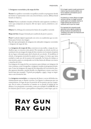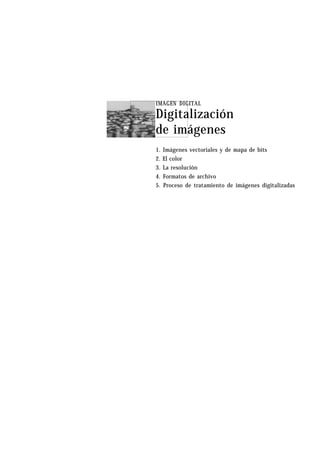 El documento describe los conceptos básicos de las imágenes digitales, incluyendo los tipos de imágenes vectoriales y de mapa de bits, los sistemas de representación del color como RGB, CMYK y escala de grises, y los formatos comunes de archivo de imágenes. Explica que las imágenes vectoriales usan objetos matemáticos mientras que las de mapa de bits usan píxeles, y que cada modo de color representa el color de manera diferente para propósitos como pantalla o impresión.