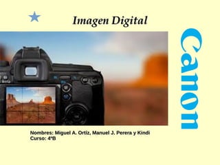 El documento define la imagen digital como una representación bidimensional de una imagen utilizando bits. Explica que las imágenes digitales pueden ser de puntos o vectoriales, y que la resolución, profundidad de color, formatos de archivo y tipos de cámaras son importantes características de las imágenes digitales. También describe cómo se pueden crear animaciones y montajes con imágenes digitales.