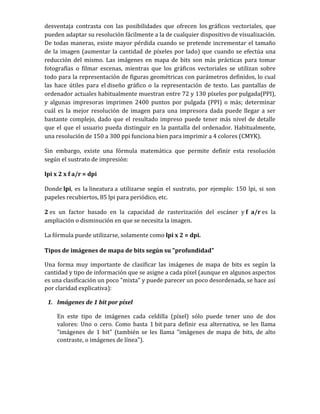 Este documento describe las imágenes de mapa de bits, también conocidas como imágenes matriciales o rasterizadas. Estas imágenes representan una matriz de píxeles de color y se definen por su altura, anchura y profundidad de color. Existen diferentes formatos como BMP, GIF y JPG que varían en su capacidad de almacenar colores y comprimir el archivo. El documento explica los conceptos clave de las imágenes de mapa de bits como la profundidad de color, resolución y diferentes modos como escala de grises, RGB y CMY