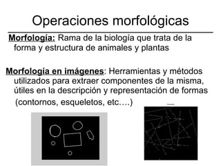 Este documento describe operaciones morfológicas en procesamiento de imágenes como dilatación, erosión, apertura y cerradura. La dilatación amplía bordes de objetos y une puntos próximos, mientras que la erosión reduce bordes y separa puntos. La apertura suaviza contornos eliminando pequeñas protuberancias, y la cerradura rellena detalles conectando objetos próximos. Estas operaciones requieren de un elemento estructural que define la vecindad de píxeles a modificar.