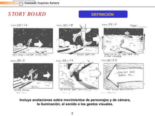 El documento define y explica los elementos de un storyboard, incluyendo viñetas, formatos, diseño visual, técnicas de cámara y movimientos. Describe cómo un storyboard representa gráficamente los planos de una película con anotaciones sobre la acción, diálogo, movimientos de cámara y más.