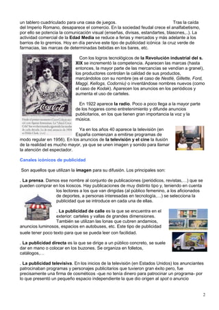 La publicidad tiene como objetivo influir en el comportamiento de los receptores informándolos y persuadiéndolos. A lo largo de la historia se han utilizado diversos métodos para anunciar productos y servicios, desde pregoneros orales en la antigüedad hasta la televisión y internet hoy en día. Los anunciantes emplean recursos visuales como la comparación, hipérbole y repetición para atraer la atención de los consumidores.