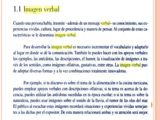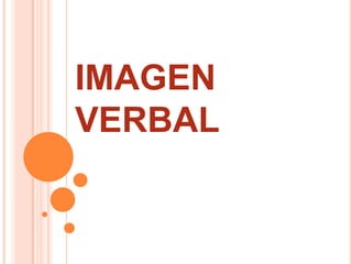 Este documento habla sobre la imagen verbal, que es la percepción que tienen las personas u organizaciones como resultado del uso de la palabra oral o escrita. Una buena imagen verbal se asocia con el éxito porque expresarse correctamente da una ventaja sobre aquellos que no lo hacen. El documento también proporciona consejos para hablar en público como respirar correctamente y sonreír, así como recomendaciones para preparar un mensaje como mantenerlo sencillo, breve y ordenado.