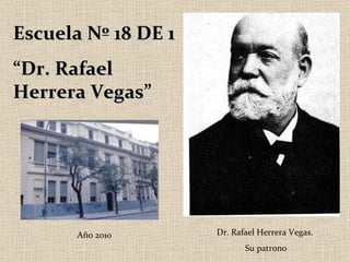 La escuela No 18 de 1 "Dr. Rafael Herrera Vegas" lleva el nombre de su patrono, el Dr. Rafael Herrera Vegas. El documento presenta imágenes de época de la escuela del año 2010.